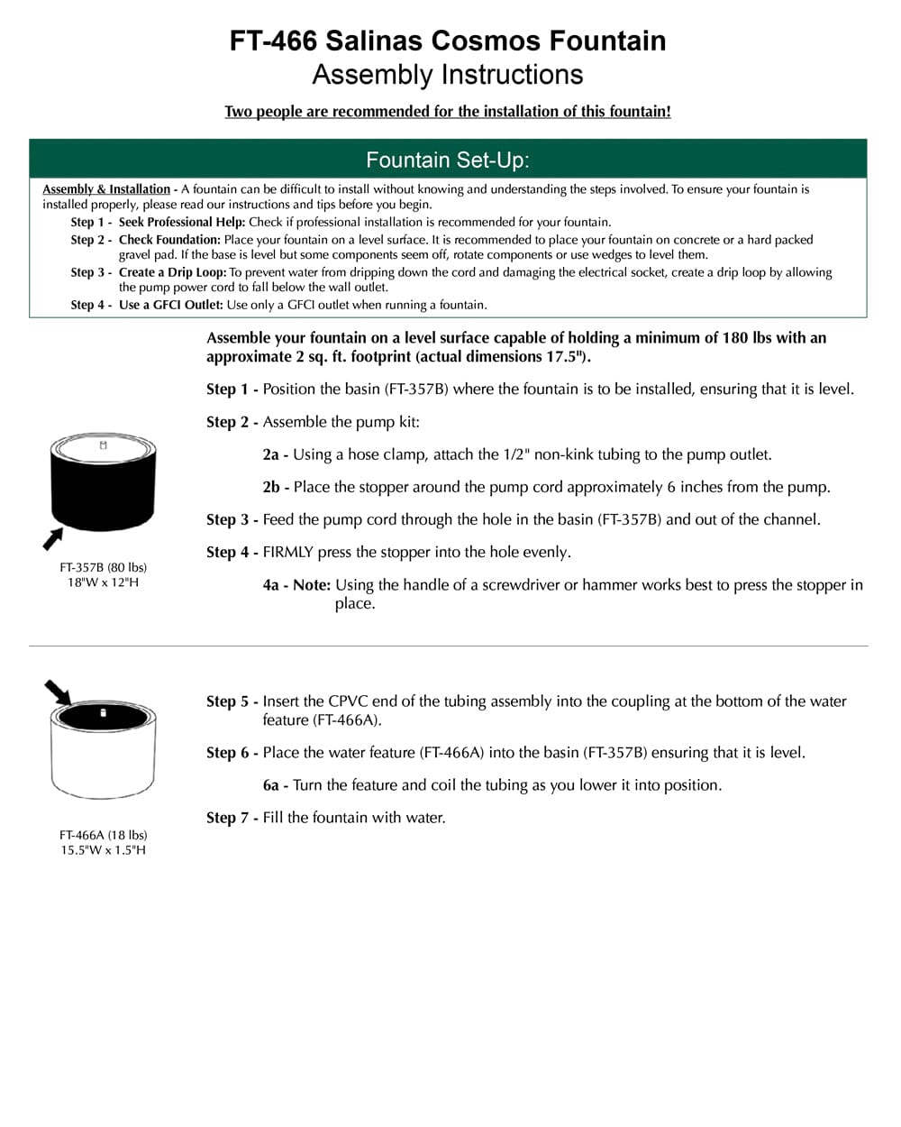 We suggest that birdbath/fountain tops not be left outside in the winter. Once the top fills with water/snow and freezes, the top may crack. All birdbath/fountain bases, bench legs and statuary should be raised up off the ground in winter so they will not freeze to the ground surface. Ideally, a fountain should be stored indoors in the winter away from the elements. However, if a fountain bowl must be left outside, remove all pumps, rubber stoppers, drain pipes, finials and small components, and cover the top with burlap or any absorbent material (old blanket/towel) and then wrapped with dark plastic, making sure that water does not accumulate in the basin and freeze. Fountain pumps, finials, and other small components should be stored indoors. Check the fountain periodically to insure that the cover is secure and water is not accumulating in any fountain component.