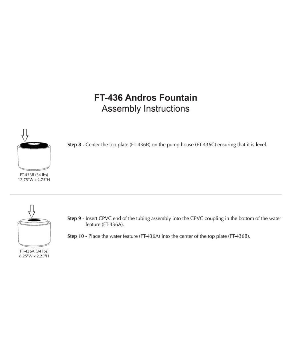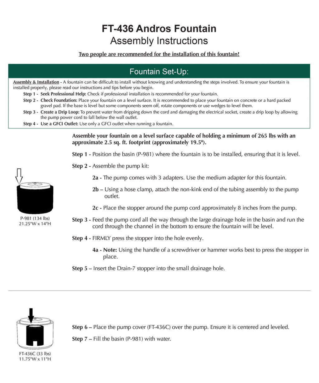 We suggest that birdbath/fountain tops not be left outside in the winter. Once the top fills with water/snow and freezes, the top may crack. All birdbath/fountain bases, bench legs and statuary should be raised up off the ground in winter so they will not freeze to the ground surface. Ideally, a fountain should be stored indoors in the winter away from the elements. However, if a fountain bowl must be left outside, remove all pumps, rubber stoppers, drain pipes, finials and small components, and cover the top with burlap or any absorbent material (old blanket/towel) and then wrapped with dark plastic, making sure that water does not accumulate in the basin and freeze. Fountain pumps, finials, and other small components should be stored indoors. Check the fountain periodically to insure that the cover is secure and water is not accumulating in any fountain component.