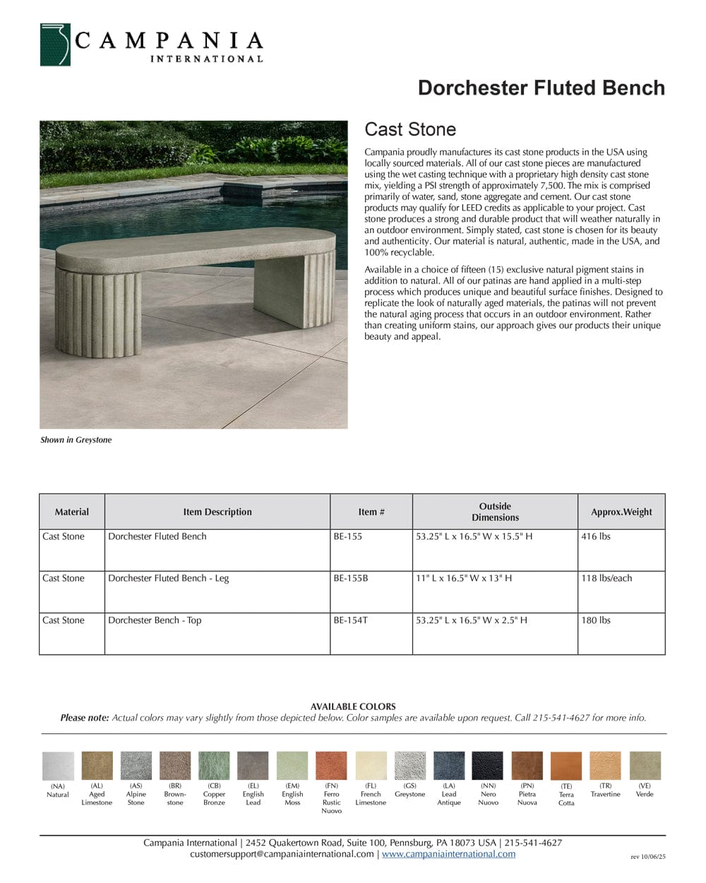 Campania proudly manufactures its cast stone products in the USA using locally sourced materials. All of our cast stone pieces are manufactured using the wet casting technique with a proprietary high density cast stone mix, yielding a PSI strength of approximately 7,500. The mix is comprised primarily of water, sand, stone aggregate and cement. Our cast stone products may qualify for LEED credits as applicable to your project. Cast stone produces a strong and durable product that will weather naturally in an outdoor environment. Simply stated, cast stone is chosen for its beauty and authenticity. Our material is natural, authentic, made in the USA, and 100% recyclable.