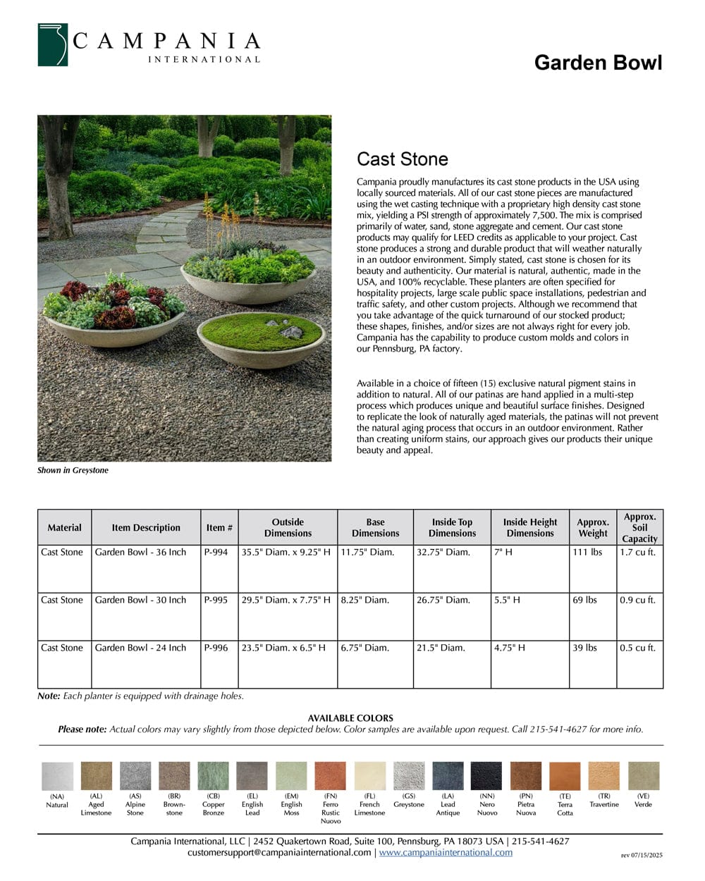 Campania proudly manufactures its cast stone products in the USA using locally sourced materials. All of our cast stone pieces are manufactured using the wet casting technique with a proprietary high density cast stone mix, yielding a PSI strength of approximately 7,500. The mix is comprised primarily of water, sand, stone aggregate and cement. Our cast stone products may qualify for LEED credits as applicable to your project. Cast stone produces a strong and durable product that will weather naturally in an outdoor environment. Simply stated, cast stone is chosen for its beauty and authenticity. Our material is natural, authentic, made in the USA, and 100% recyclable.