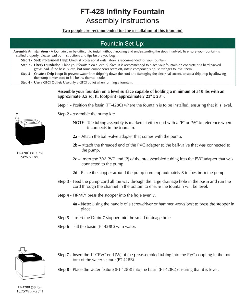 We suggest that birdbath/fountain tops not be left outside in the winter. Once the top fills with water/snow and freezes, the top may crack. All birdbath/fountain bases, bench legs and statuary should be raised up off the ground in winter so they will not freeze to the ground surface. Ideally, a fountain should be stored indoors in the winter away from the elements. However, if a fountain bowl must be left outside, remove all pumps, rubber stoppers, drain pipes, finials and small components, and cover the top with burlap or any absorbent material (old blanket/towel) and then wrapped with dark plastic, making sure that water does not accumulate in the basin and freeze. Fountain pumps, finials, and other small components should be stored indoors. Check the fountain periodically to insure that the cover is secure and water is not accumulating in any fountain component.