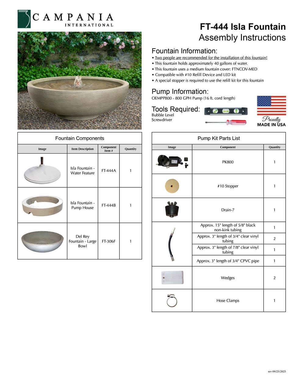 To keep a constant water level in your fountain, you can add the auto refill system. It comes with a float valve, concrete base, custom stopper, clear tubing, and a pressure relief garden hose or spigot connection. The device is connected to a garden hose or spigot, and the water is turned on and off by the valve in the unit, keeping your fountain filled effortlessly.