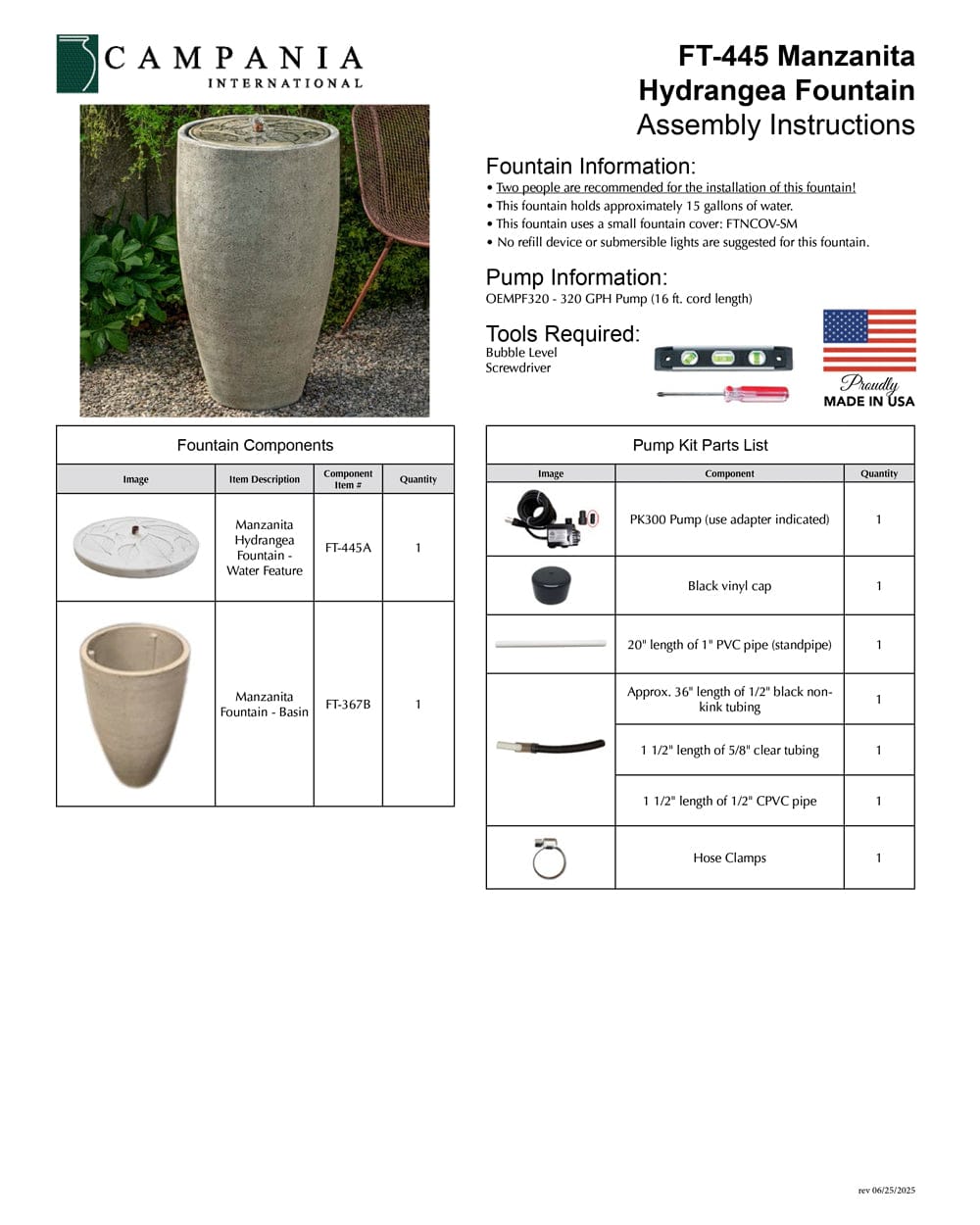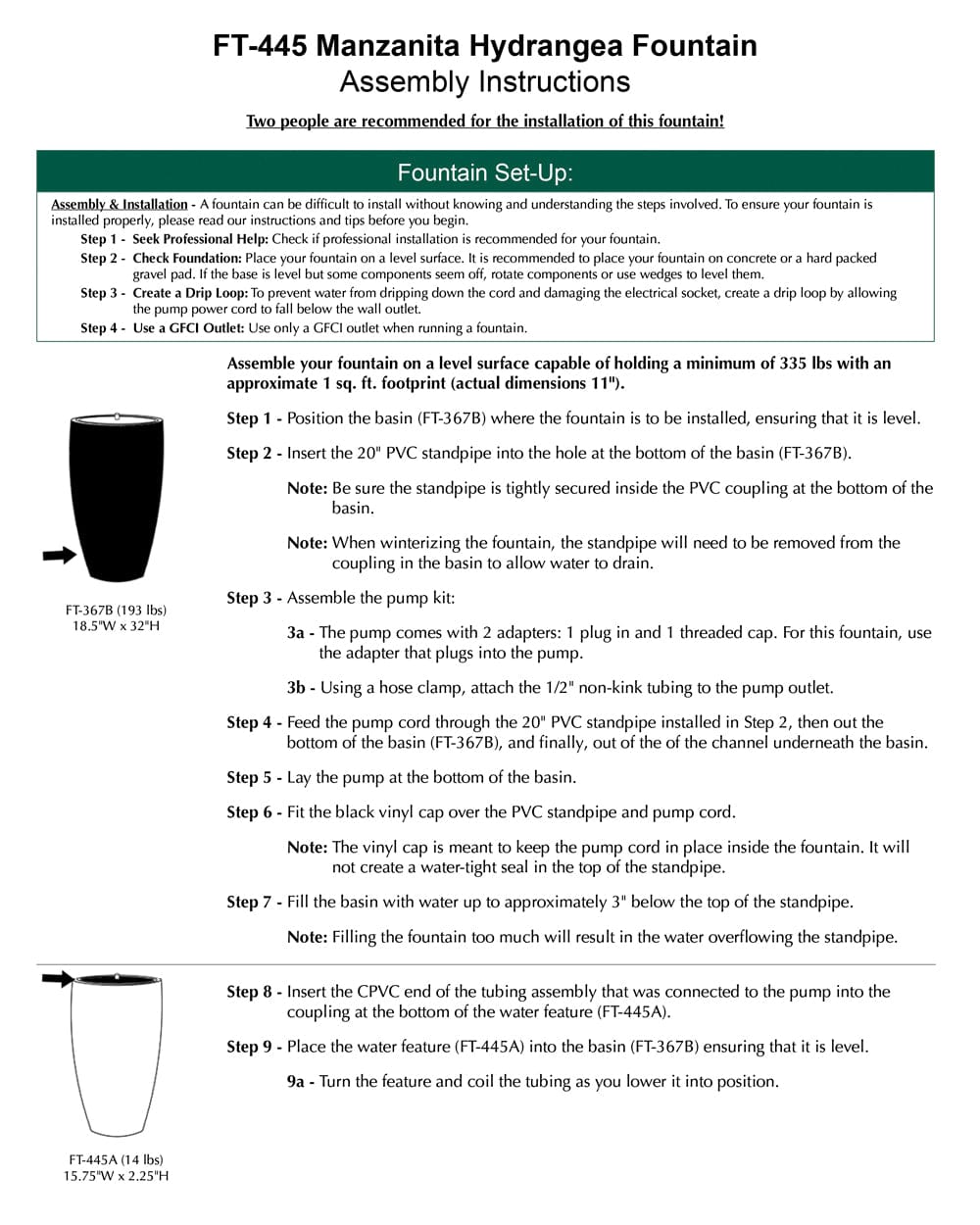 - All hardware and tubing required to properly assemble the fountain