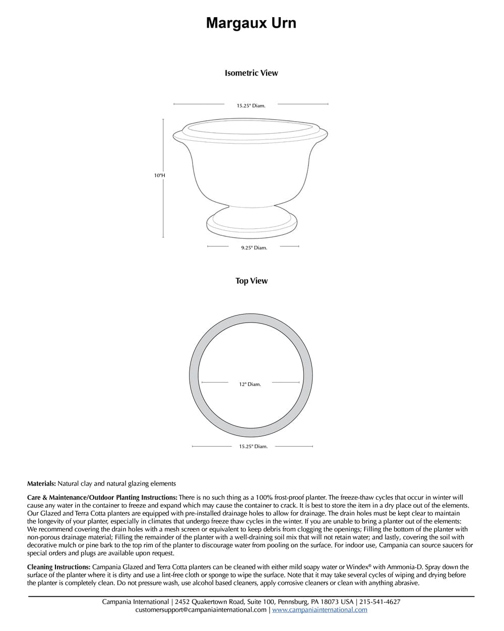 Cleaning Instructions: Campania Glazed and Terra Cotta planters can be cleaned with either mild soapy water or Windex® with Ammonia-D. Spray down the surface of the planter where it is dirty and use a lint-free cloth or sponge to wipe the surface. Note that it may take several cycles of wiping and drying before the planter is completely clean. Do not pressure wash, use alcohol based cleaners, apply corrosive cleaners or clean with anything abrasive.