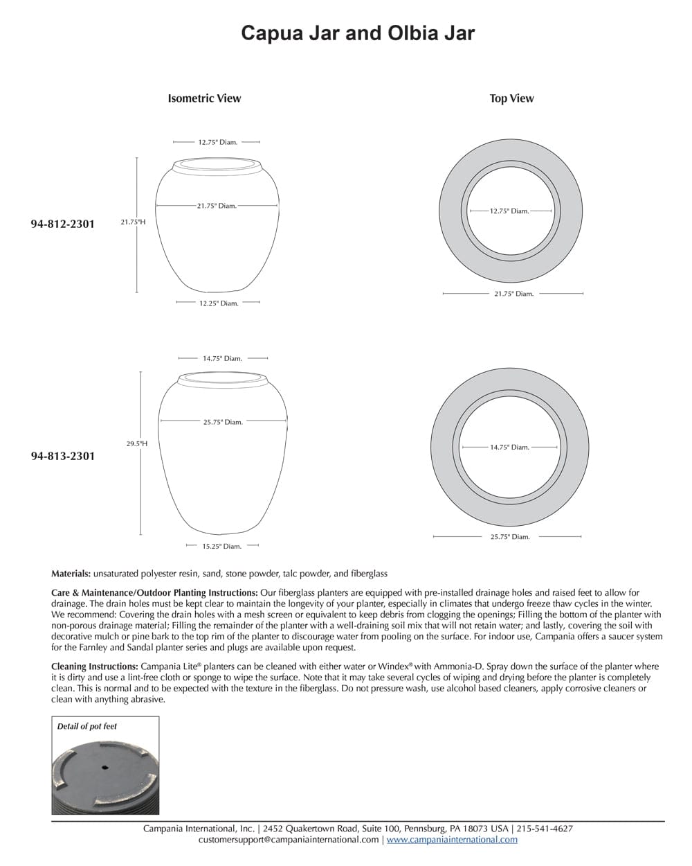 Cleaning Instructions: Campania Lite® planters can be cleaned with either water or Windex® with Ammonia-D. Spray down the surface of the planter where it is dirty and use a lint-free cloth or sponge to wipe the surface. Note that it may take several cycles of wiping and drying before the planter is completely clean. This is normal and to be expected with the texture in the fiberglass. Do not pressure wash, use alcohol based cleaners, apply corrosive cleaners or clean with anything abrasive.