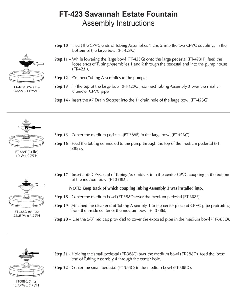 - Drainage Info: One drainage hole in the side wall of the fiberglass basin and one off-center in the large bowl of the fountain