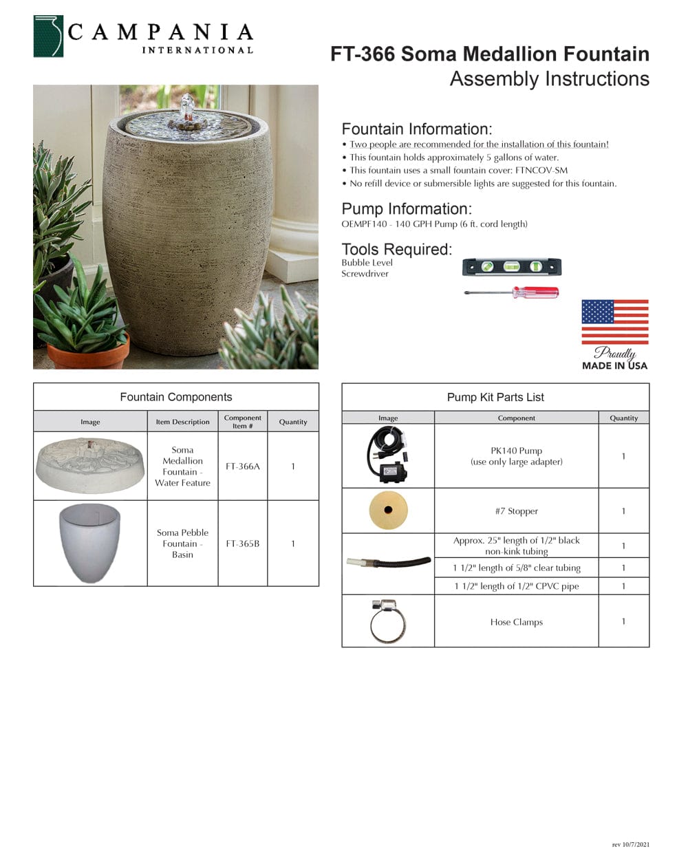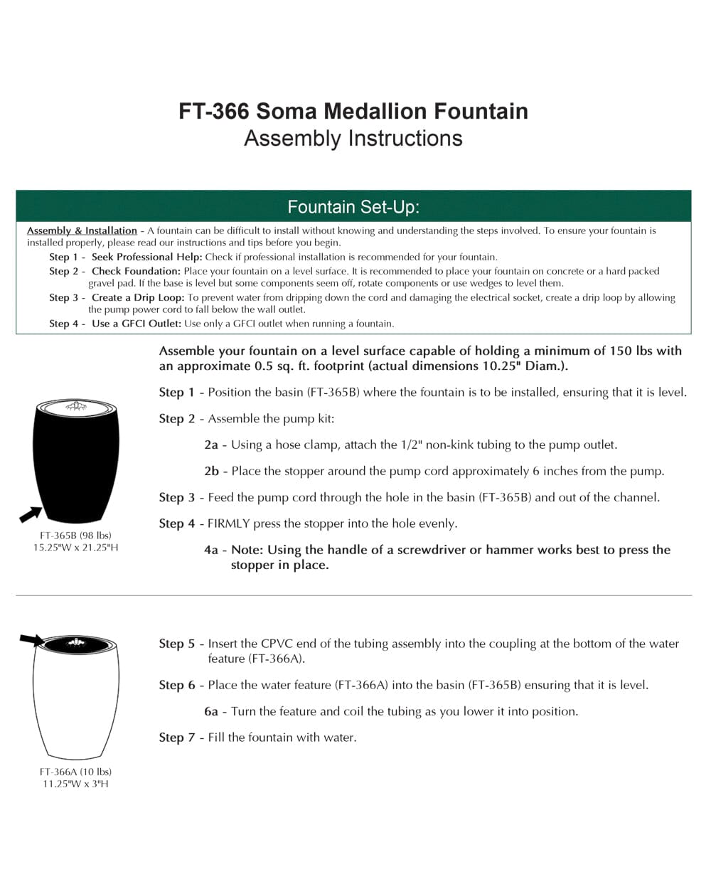 - All hardware and tubing required to properly assemble the fountain